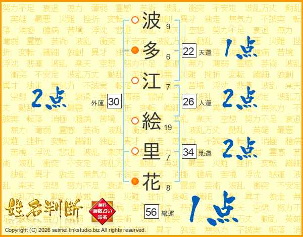 波(9画)多(6画)江(7画) 絵(19画)里(7画)花(8画)