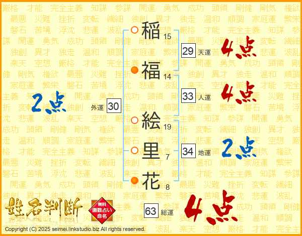 稲(15画)福(14画) 絵(19画)里(7画)花(8画)