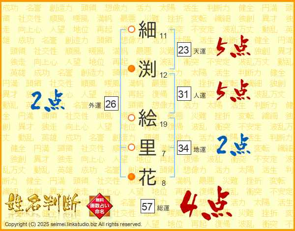 細(11画)渕(12画) 絵(19画)里(7画)花(8画)