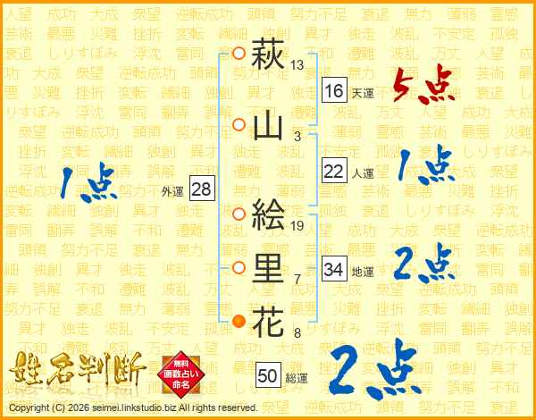 萩山絵里花さんの総運は50画の2点!