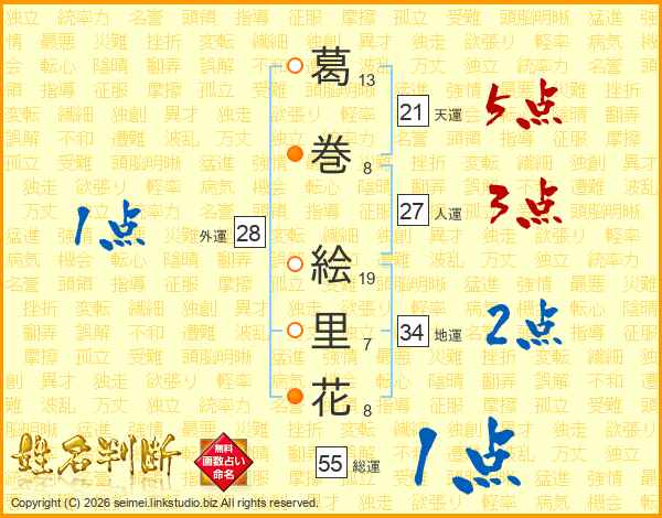 葛(13画)巻(8画) 絵(19画)里(7画)花(8画)