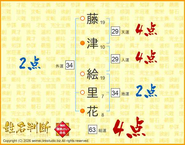 藤(19画)津(10画) 絵(19画)里(7画)花(8画)
