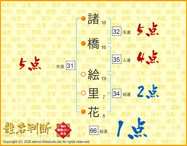 諸(16画)橋(16画) 絵(19画)里(7画)花(8画)