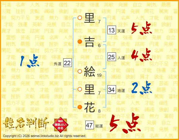 里(7画)吉(6画) 絵(19画)里(7画)花(8画)