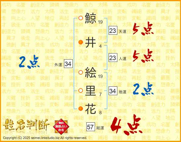 鯨(19画)井(4画) 絵(19画)里(7画)花(8画)