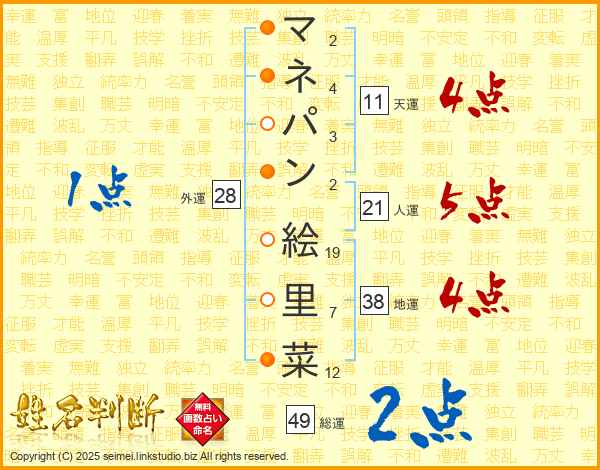 マ(2画)ネ(4画)パ(3画)ン(2画) 絵(19画)里(7画)菜(12画)