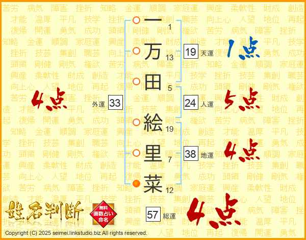 一(1画)万(13画)田(5画) 絵(19画)里(7画)菜(12画)
