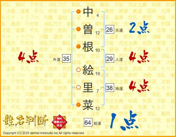 中(4画)曽(12画)根(10画) 絵(19画)里(7画)菜(12画)