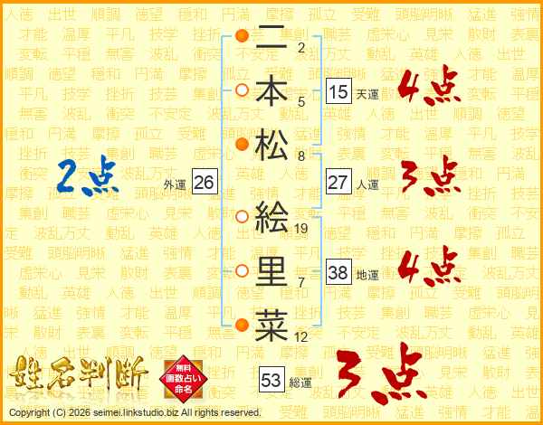 二(2画)本(5画)松(8画) 絵(19画)里(7画)菜(12画)