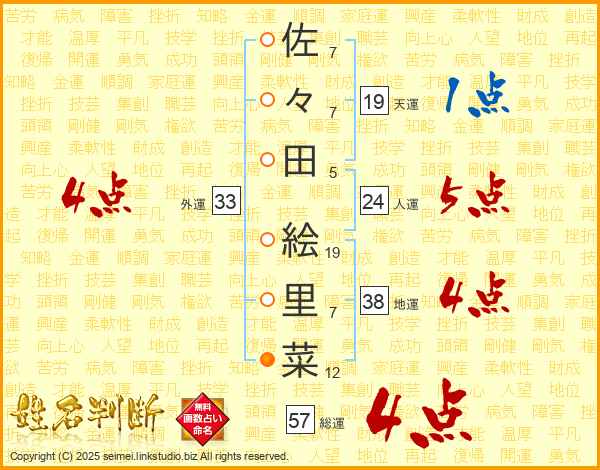 佐々田絵里菜さんの外運は33画の4点!