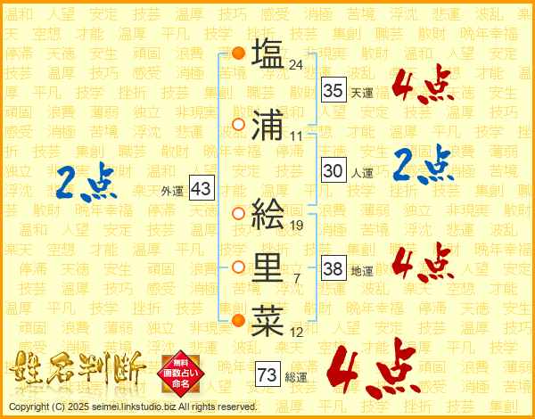 塩(24画)浦(11画) 絵(19画)里(7画)菜(12画)