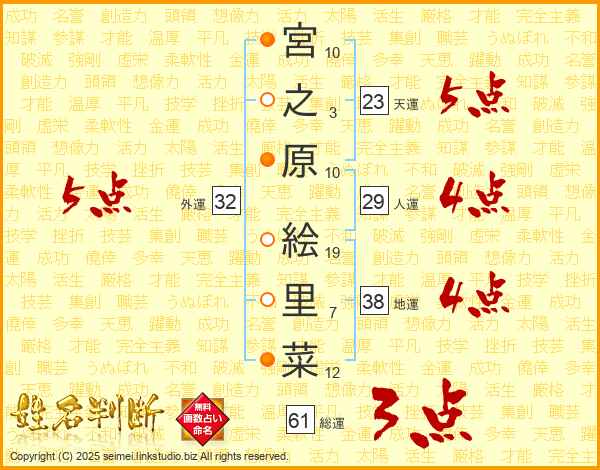 宮(10画)之(3画)原(10画) 絵(19画)里(7画)菜(12画)