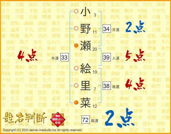 小(3画)野(11画)瀬(20画) 絵(19画)里(7画)菜(12画)