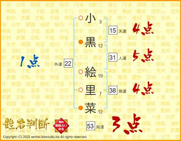 小(3画)黒(12画) 絵(19画)里(7画)菜(12画)