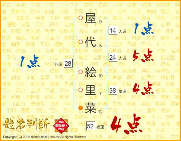 屋(9画)代(5画) 絵(19画)里(7画)菜(12画)