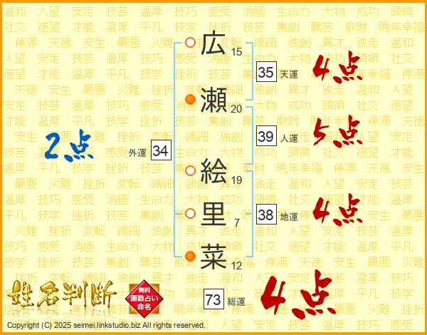 広(15画)瀬(20画) 絵(19画)里(7画)菜(12画)