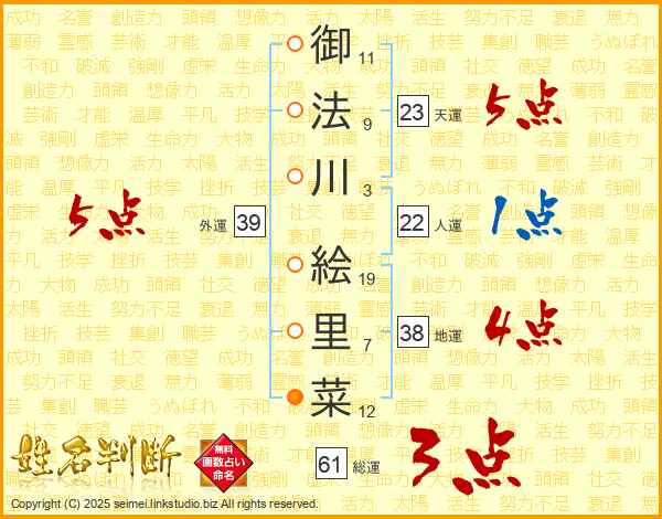 御(11画)法(9画)川(3画) 絵(19画)里(7画)菜(12画)