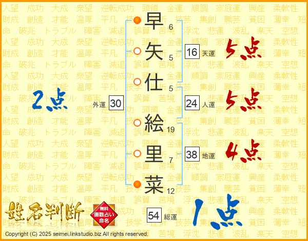 早(6画)矢(5画)仕(5画) 絵(19画)里(7画)菜(12画)