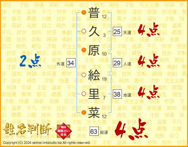 普(12画)久(3画)原(10画) 絵(19画)里(7画)菜(12画)