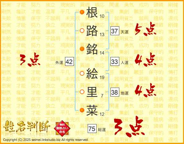 根路銘絵里菜さんの天運は37画の5点!