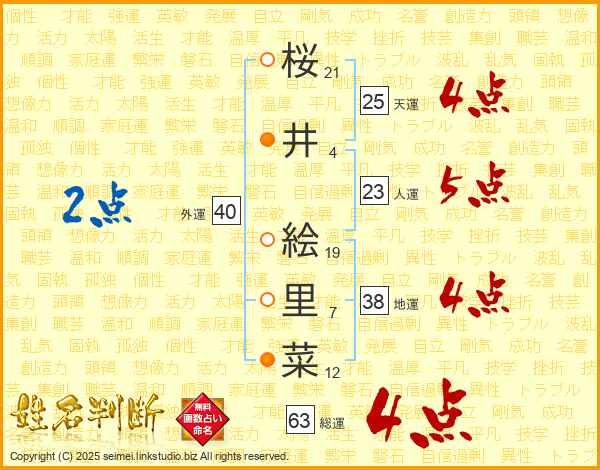 桜(21画)井(4画) 絵(19画)里(7画)菜(12画)