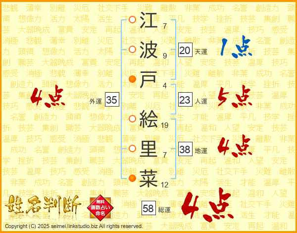 江(7画)波(9画)戸(4画) 絵(19画)里(7画)菜(12画)
