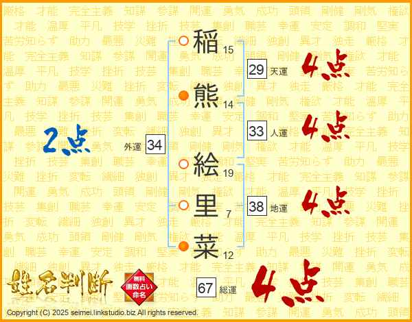 稲(15画)熊(14画) 絵(19画)里(7画)菜(12画)