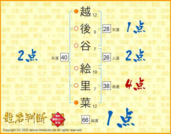 越(12画)後(9画)谷(7画) 絵(19画)里(7画)菜(12画)