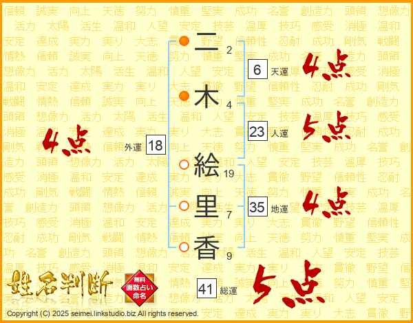 二(2画)木(4画) 絵(19画)里(7画)香(9画)