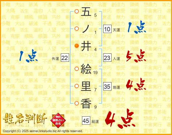 五(5画)ノ(1画)井(4画) 絵(19画)里(7画)香(9画)