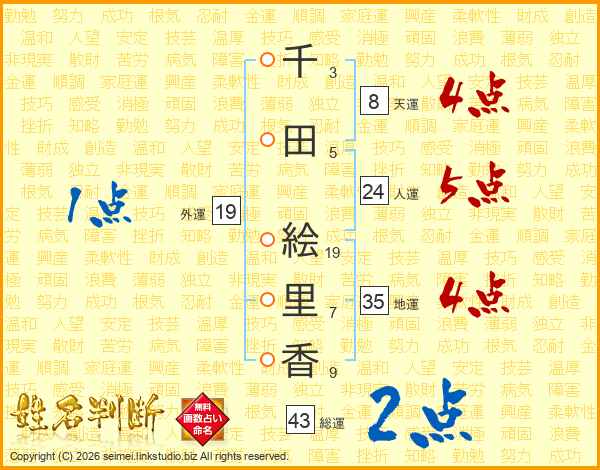 千(3画)田(5画) 絵(19画)里(7画)香(9画)