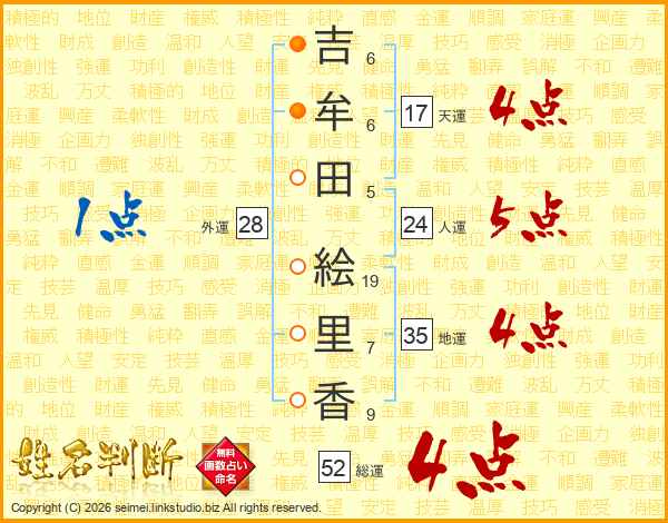 吉(6画)牟(6画)田(5画) 絵(19画)里(7画)香(9画)