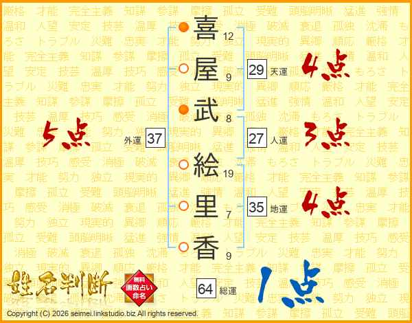 喜(12画)屋(9画)武(8画) 絵(19画)里(7画)香(9画)