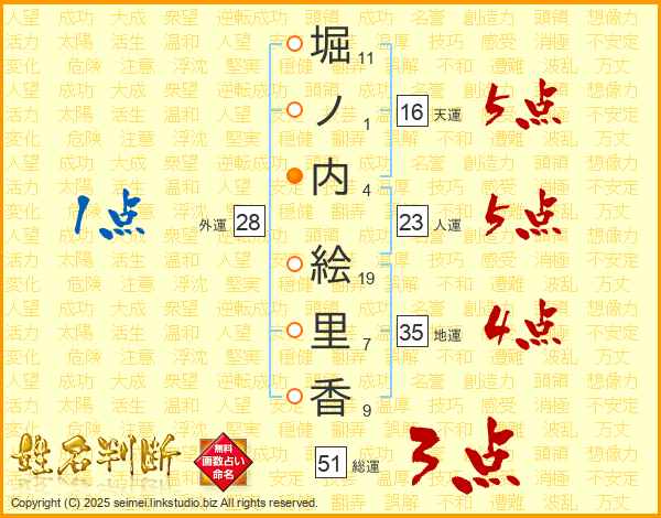 堀(11画)ノ(1画)内(4画) 絵(19画)里(7画)香(9画)
