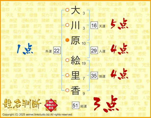 大(3画)川(3画)原(10画) 絵(19画)里(7画)香(9画)