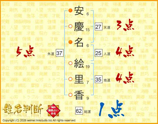 安(6画)慶(15画)名(6画) 絵(19画)里(7画)香(9画)
