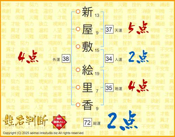 新(13画)屋(9画)敷(15画) 絵(19画)里(7画)香(9画)