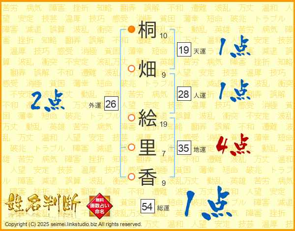 桐(10画)畑(9画) 絵(19画)里(7画)香(9画)