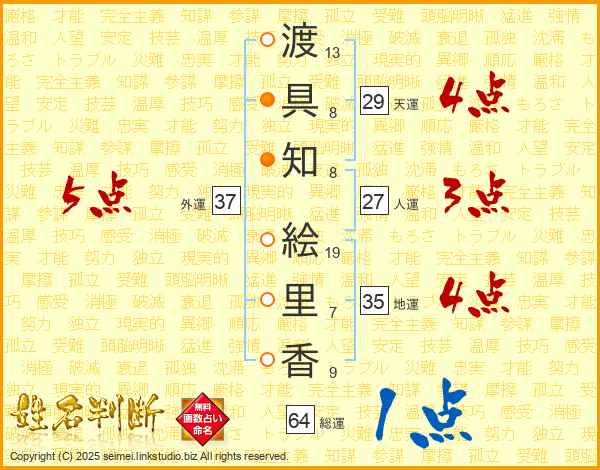 渡(13画)具(8画)知(8画) 絵(19画)里(7画)香(9画)