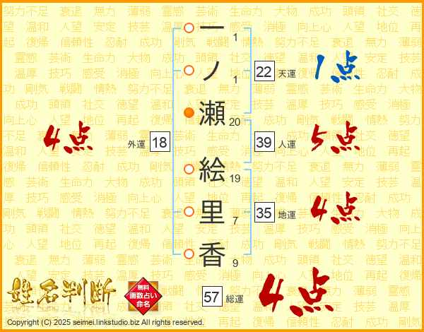 一(1画)ノ(1画)瀬(20画) 絵(19画)里(7画)香(9画)
