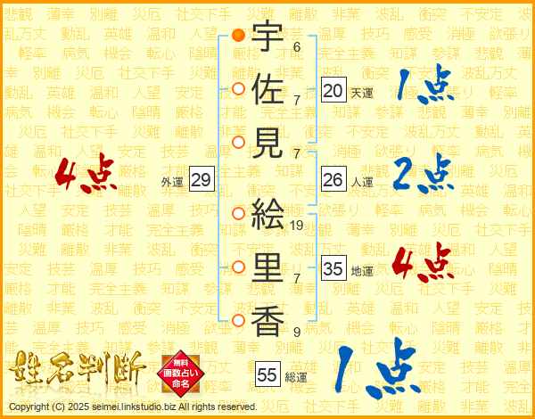宇(6画)佐(7画)見(7画) 絵(19画)里(7画)香(9画)