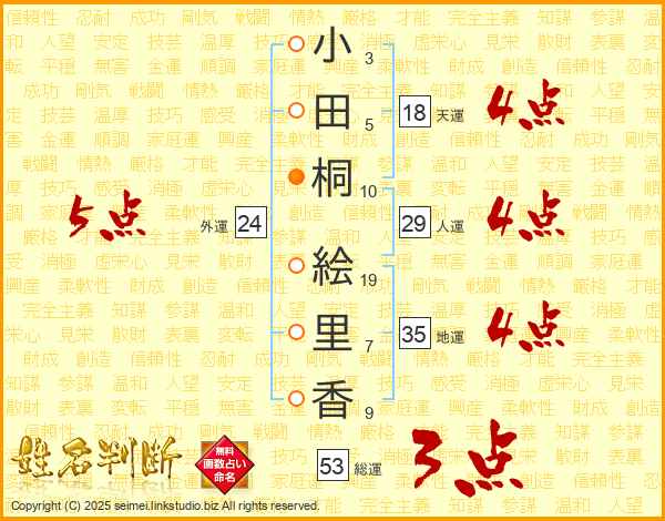 小(3画)田(5画)桐(10画) 絵(19画)里(7画)香(9画)
