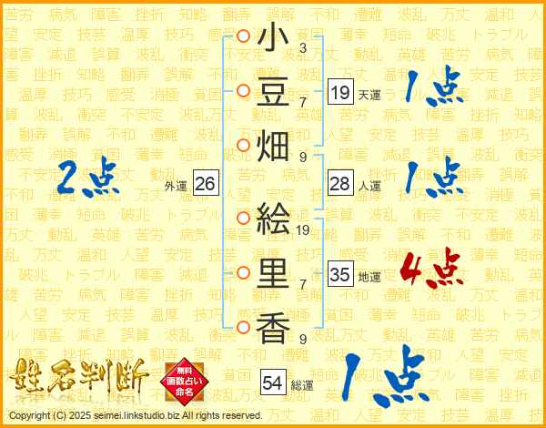 小(3画)豆(7画)畑(9画) 絵(19画)里(7画)香(9画)