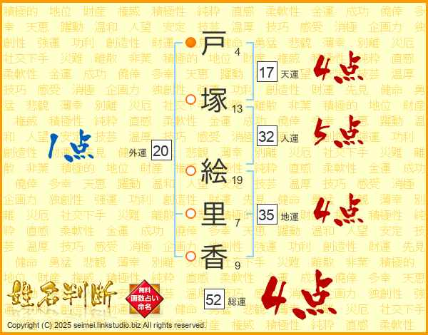 戸(4画)塚(13画) 絵(19画)里(7画)香(9画)