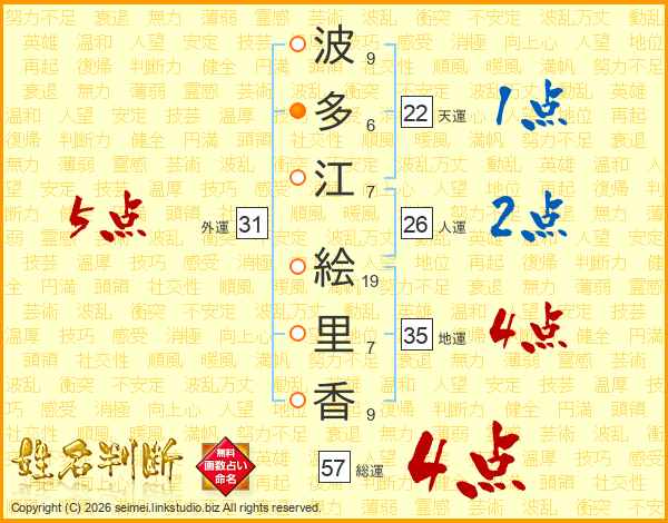 波(9画)多(6画)江(7画) 絵(19画)里(7画)香(9画)