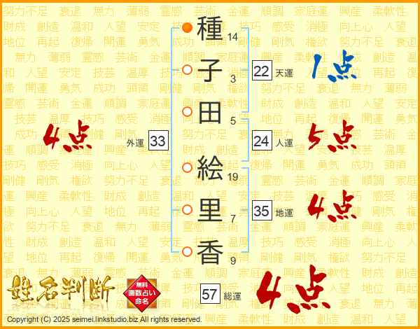 種(14画)子(3画)田(5画)  絵(19画)里(7画)香(9画)