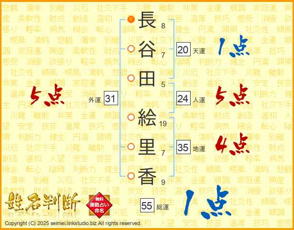 長(8画)谷(7画)田(5画) 絵(19画)里(7画)香(9画)