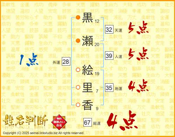 黒(12画)瀬(20画) 絵(19画)里(7画)香(9画)