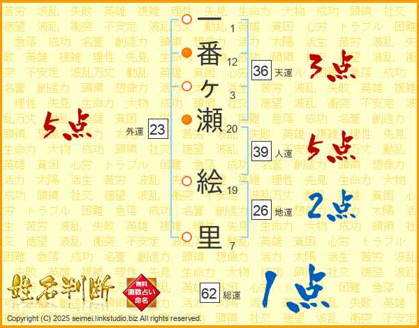 一番ヶ瀬絵里さんの人運は39画の5点!