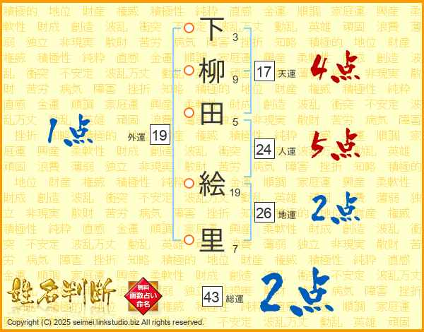 下(3画)柳(9画)田(5画) 絵(19画)里(7画)